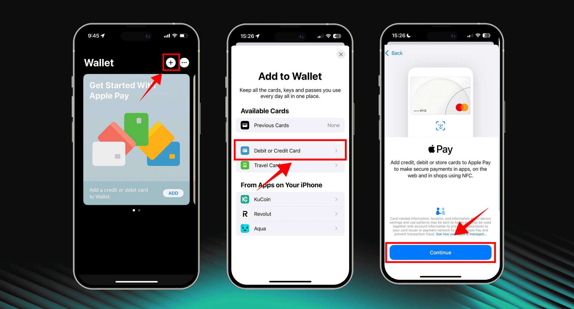 Open Apple Wallet → tap + → choose Debit or Credit Card → tap Continue.