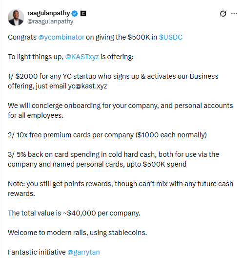 If you’re a Y Combinator (YC) startup, we at KAST are giving you a bundle you can claim when you activate KAST Business. This follows YC’s $500,000 in USDC rollout. Our CEO, Raagulan Pathy, shared the details on X, and the offer is live for YC companies.