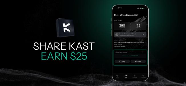 Earn $25 when a referred friend spends $100, and your friend earns $100 after spending $1,000 with KAST.